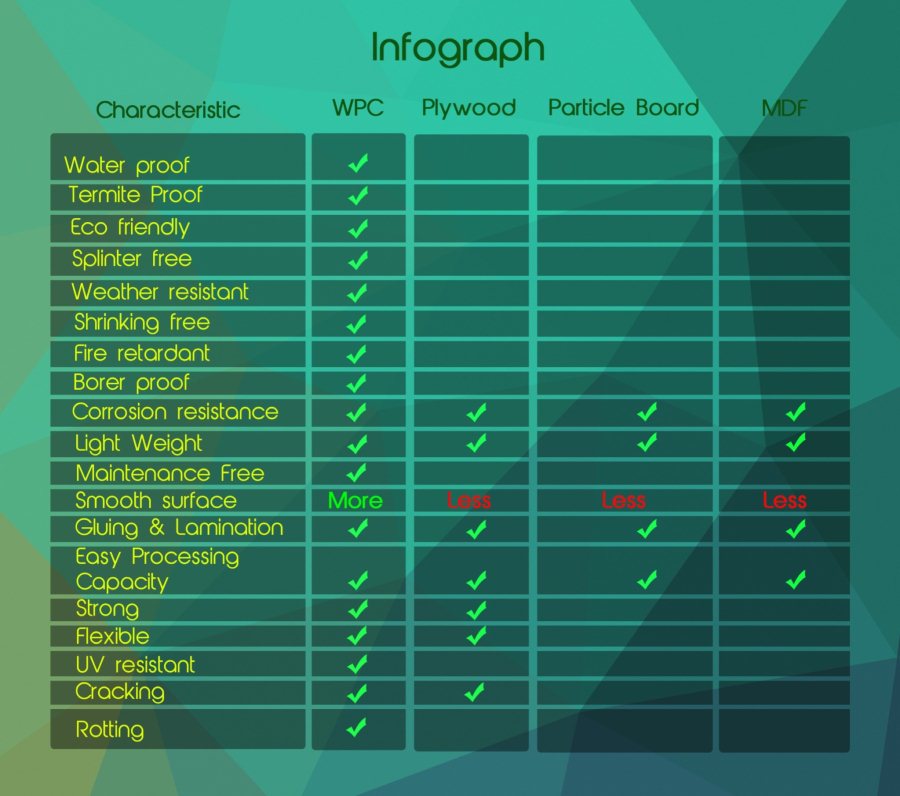 Another inherent feature of Wood Composite Products is its ability to Completely Prevent Termite Infestation. Termite's effects are damaging, costing the economy approximately $20 billion each year in wood structure damage. As the demand for the wood due to this damage increases multi-fold, a spiraling increase in deforestation activities has been witnessed. Wood Composite Products are the technology of future and have been designed to contain this damage. Wood Composite Products have been extensively tested in termite-prone conditions and have been found Termite Proof.